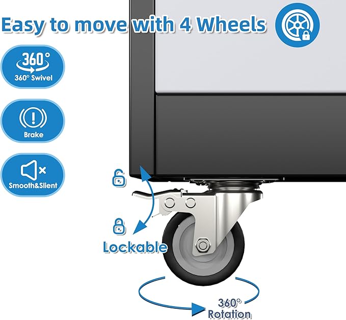 - Rolling Wheels:Metal broom storage cabinet with 4 detachable casters you can easily move in any direction, each wheel with a fixed lock, when you move the cabinet to the right position to be able to fix it on the floor. The wheels are made of rubber, which can effectively reduce noise and protect the floor. The four bottom corners are equipped with protective devices to prevent collision injuries.