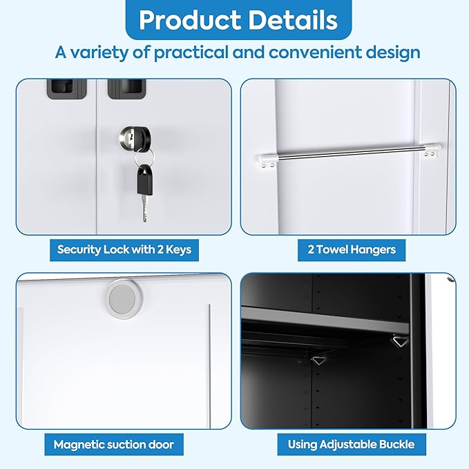 - Amazing Design:This broom closet storage cabinet interior with hanging rods and adjustable shelves with rods to hang tools or clothes ,which also has holes on the back and side panels, makes it easier to store tools. This cabinet is perfect for garage storage of cleaning tools or as an office closet.