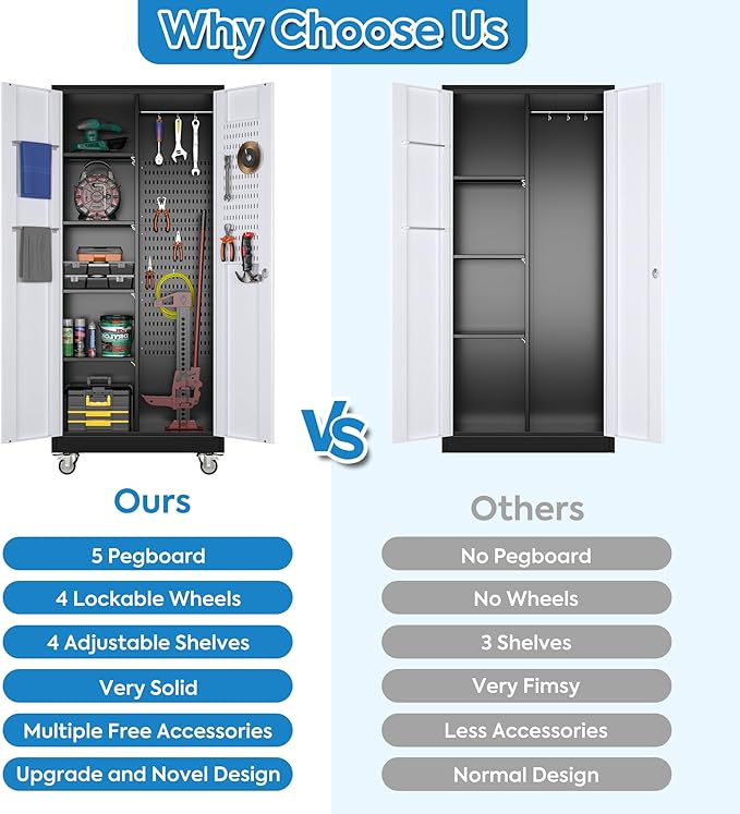 - Magnetic Doors:This garage storage cabinet is designed with magnetic suction on the door frame, which can keep the door closed without locking, not only enhancing the tidiness but also improving the safety.