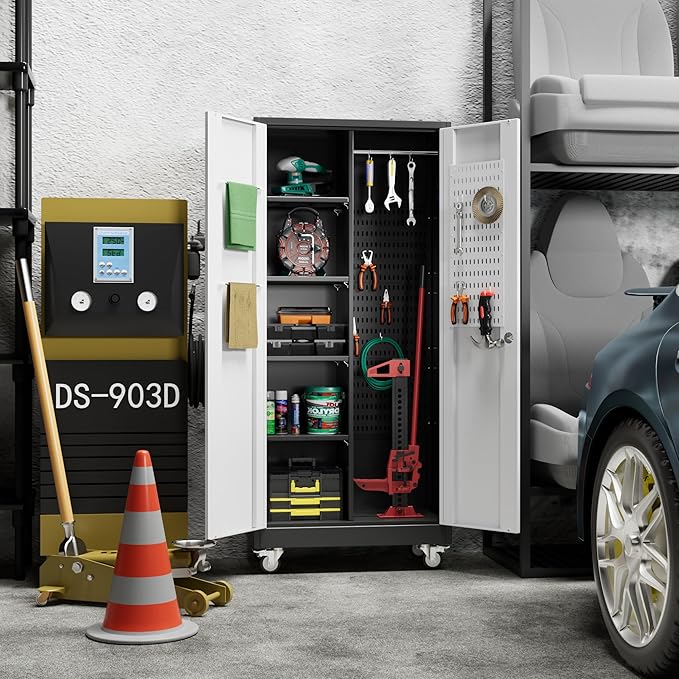 71" H Broom Closet Storage Cabinet with Wheels and Pegboard,Metal Garage Storage Cabinet with Lockable and Magnetic Doors,Adjustable Shelves for Garage Home Office,Required Assembly,Black and White