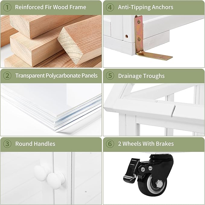 - 🌲【Mobility, Stability & Smart Ventilation】 Equipped with 2 removable wheels (brakes included) and anti-tipping anchors, this cold frame is easy to move and secure in any outdoor space. The adjustable roof panel with drainage troughs ensures proper ventilation and prevents waterlogging, while dual front doors provide full access to your plants