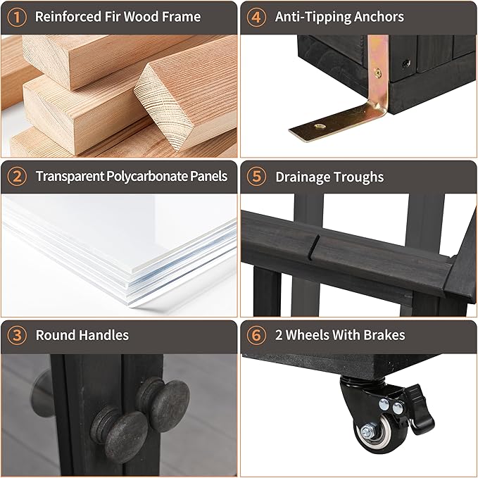 - 🌲【Mobility, Stability & Smart Ventilation】 Equipped with 2 removable wheels (brakes included) and anti-tipping anchors, this cold frame is easy to move and secure in any outdoor space. The adjustable roof panel with drainage troughs ensures proper ventilation and prevents waterlogging, while dual front doors provide full access to your plants