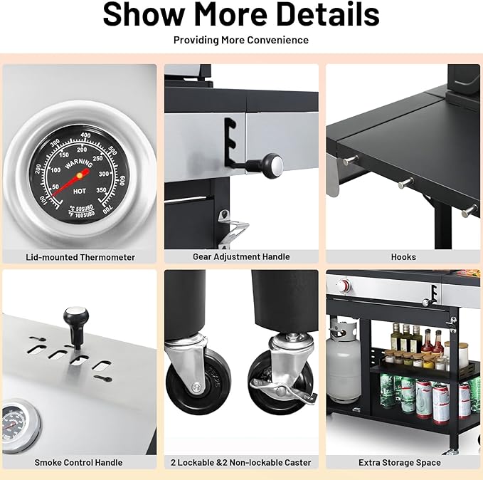 - Family-Friendly Design: Featuring easy-lifting charcoal system, a built-in bottle opener, side hooks and storage shelf cabinet for grilling tools, this grill is designed to make outdoor cooking fun and convenient for everyone.