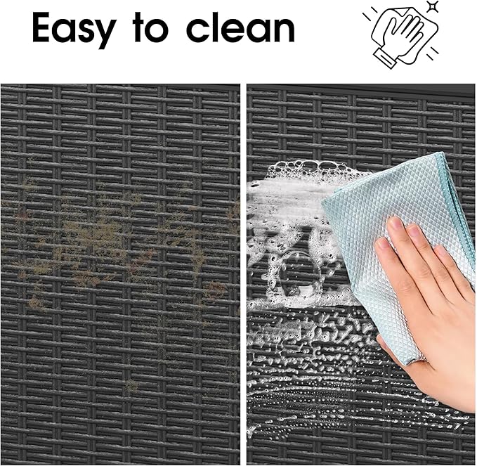 - âïžăPREMIUM RESIN MATERIALă Made of high-density polypropylene resin, this storage bin is waterproof, UV-resistant, and dustproof. The rattan-inspired texture not only adds elegance to your space but also blends seamlessly with patio or garden dĂ©cor.