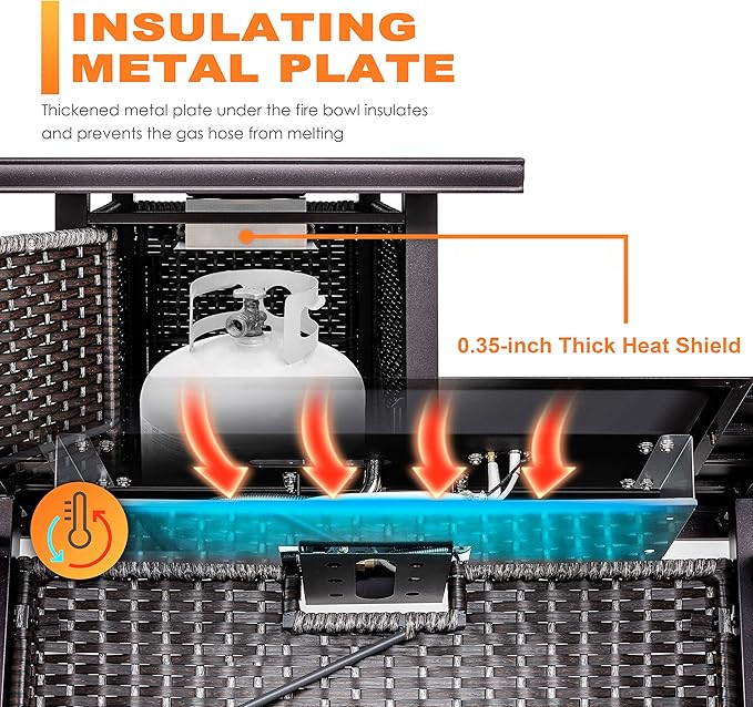 - DURABLE METAL MATERIAL: Heavy-duty rust- and weather-resistant aluminum panels with a matching iron frame protect a powerful heating element and ensure years of outdoor heating. Hidden door panel with a magnetic clip allows instant access for easy cylinder replacement. Thickened iron tank base can hold a standard 20-pound propane gas tank (not included). The insulating metal plate under the fire bowl prevents the gas hose from melting due to high heat