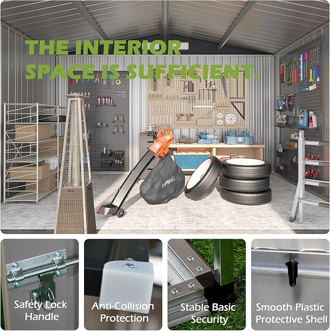 - Practical Outdoor Storage Shed: Our 8×10 FT storage shed has a sloping roof design, combined with waterproof materials, improving drainage efficiency. The surface of the metal shed has been treated with anti-corrosion and rust prevention to adapt to changing weather environments and protect the tools placed inside from damage