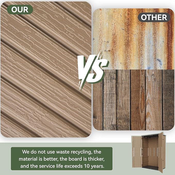 - 【Thickened Resin Material】This garden shed is crafted from specially processed double-layer resin boards, offering stronger wind resistance and greater resistance to bending compared to standard plastic sheds. It is non-toxic, odorless, weather-resistant, fade-proof, UV-protected, easy to clean and maintain, with a service life far exceeding 10 years