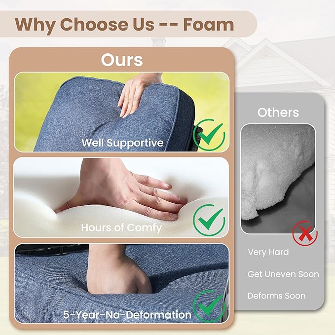 - Texture Woven Fabric: Cushions are covered by yarn dyed woven fabric,the yarns are dyed and UV treated before woven into fabric for out door fading resistant and water repellent. Looks and touches with high-end woven texture. No more worry about getting cheaply made thin print fabric. Detachable & washable
