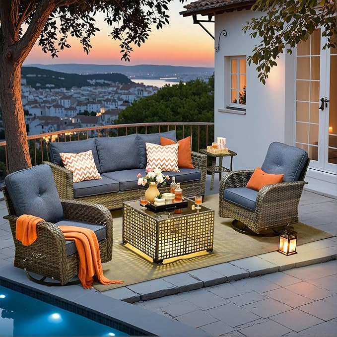 HOOOWOOO Outdoor Patio Furniture Set,5 Pieces Wicker Conversation Set,All Weather Couch Set with Swivel Chairs Solar Light Table 5 Seaters for Out Door Yard(Denim Blue)