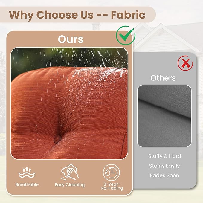 - Texture Woven Fabric: Cushions are covered by yarn dyed woven fabric,the yarns are dyed and UV treated before woven into fabric for out door fading resistant and water repellent. Looks and touches with high-end woven texture. No more worry about getting cheaply made thin print fabric. Detachable & washable