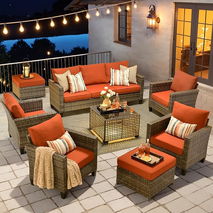 HOOOWOOO Outdoor Patio Furniture Set,8 Pieces Wicker Conversation Set,All Weather Couch Set with Solar Light Table Ottoman Chairs 9 Seaters for Out Door Yard(Brick Red)