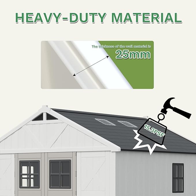 - Heavy-Duty Blow-Molded HDPE Construction – Built with durable blow-molded HDPE plastic, this shed offers exceptional strength and has a roof load capacity of 75kg/m², perfect for heavy storage needs.