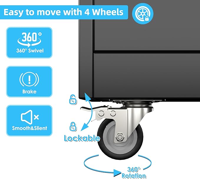 - Rolling Wheels:Metal broom storage cabinet with 4 detachable casters you can easily move in any direction, each wheel with a fixed lock, when you move the cabinet to the right position to be able to fix it on the floor. The wheels are made of rubber, which can effectively reduce noise and protect the floor. The four bottom corners are equipped with protective devices to prevent collision injuries.