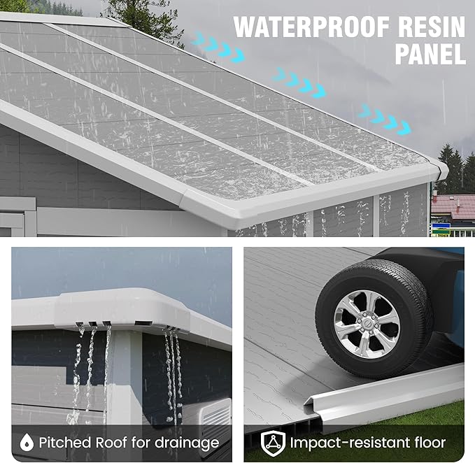- [DOUBLE-WALL & STABLE STORAGE SHED]: Tough, double-wall resin construction and an impact-resistant floor are designed for long-term durability. The overlapping wall panels are water and moisture resistant for worry-free use in all weather conditions,Weather-resistant, waterproof and UV protected - will not peel, rot or rust.