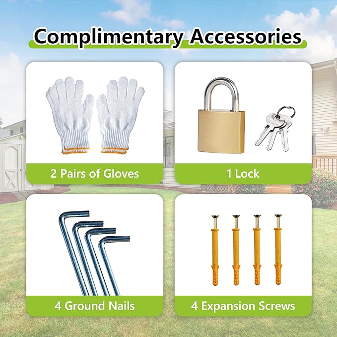 - Easy Assembly: Includes pre-drilled parts, labeled components, and detailed step-by-step instructions for hassle-free setup. All required hardware is provided, so you can have your shed ready in no timeāno special tools needed!