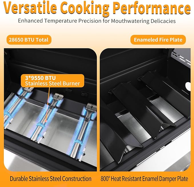 - EFFICIENT 3-BURNER SYSTEM & RELIABLE IGNITION: Features three powerful stainless steel tube burners, each delivering 9550 BTU, totaling 28650 BTU for rapid heating and precise temperature control; Coupled with an 800-degree high-temperature porcelain-enameled flame tamer for even heat distribution and a reliable safety ignition system for hassle-free startups.