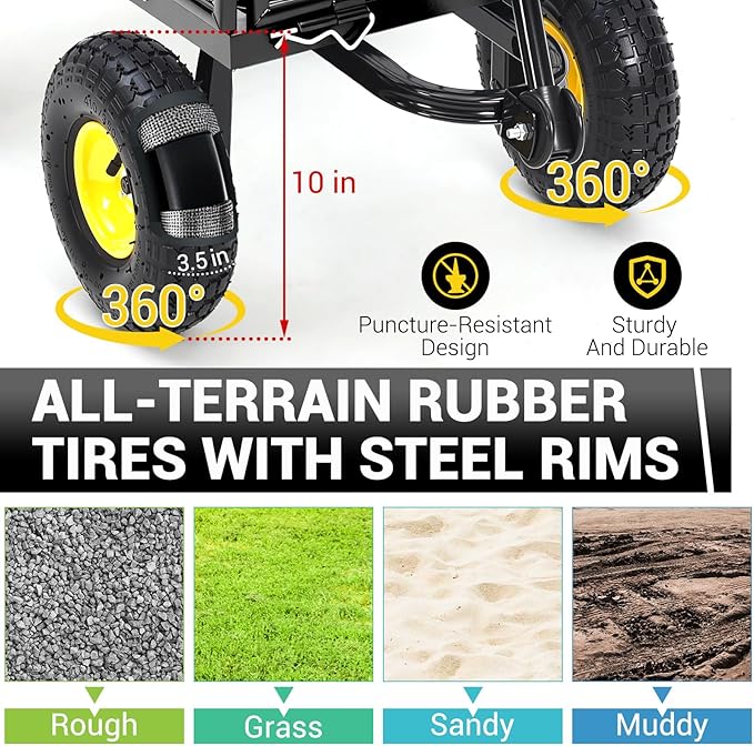 - USER-FRIENDLY SWIVEL HANDLE: The cart is equipped with a 180-degree swivel handle for easier maneuvering. The handle has a rubberized grip, which increases operating comfort and reduces fatigue during prolonged use. This thoughtful design allows you to navigate through tight spaces and corners with ease, making gardening more efficient.