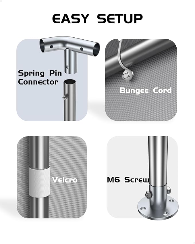 - Easy Assembly System: This carport features a smart design with pre-numbered parts that simply click together - no tools required. Two people can set it up in just 35-45 minutes. The package includes sturdy D-rings spaced every 18 inches, 12-inch ground stakes, and heavy-duty ratchet straps for secure anchoring. Extra-strong stitching at all connection points and reinforced edges ensure long-lasting performance whether you use it year-round or just seasonally.