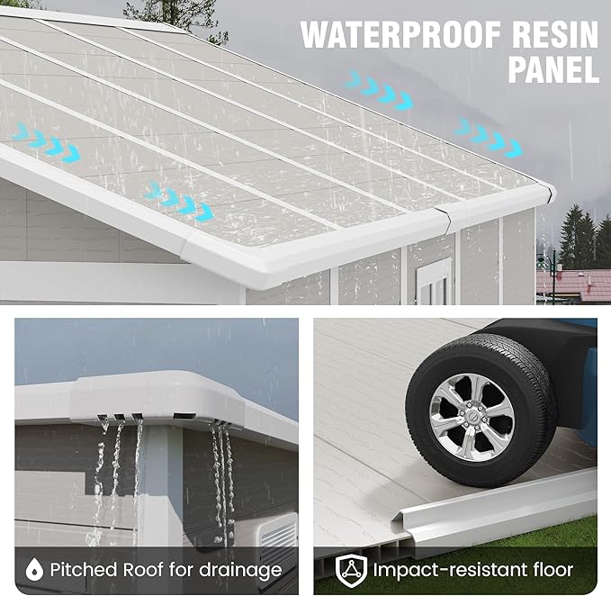 - [DOUBLE-WALL & STABLE STORAGE SHED]: Tough, double-wall resin construction and an impact-resistant floor are designed for long-term durability. The overlapping wall panels are water and moisture resistant for worry-free use in all weather conditions,Weather-resistant, waterproof and UV protected - will not peel, rot or rust.