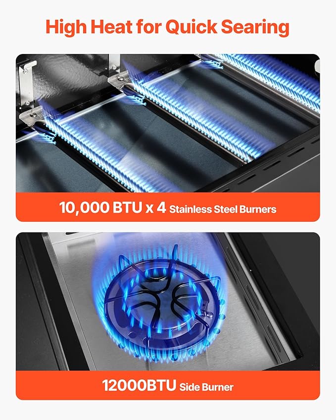 - High-Efficiency Heating: This freestanding propane gas grill runs on a gas cylinder and includes three stainless steel burners (each outputting 10,000 BTUs) plus a 10,000 BTU side burner, delivering a total of 52,000 BTUs of strong heat. It ensures quick, even heating for searing meat or fast-cooking vegetables, keeping large meals moving efficiently