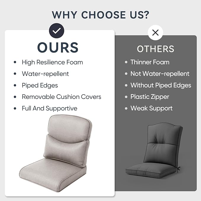 - Perfect Fit & Generous Dimensions: Achieve a custom-fit look with our patio cushion set, including 1 seat cushion (22" W x 24" D x 4" T) and 1 back cushion (22" W x 22" H x 6" T). This deep seat cushion and tall back are designed for superior comfort and support on most outdoor furniture. Pro Tip: For the perfect fit, we recommend measuring your furniture's seating area before ordering to ensure ideal coverage and a seamless look