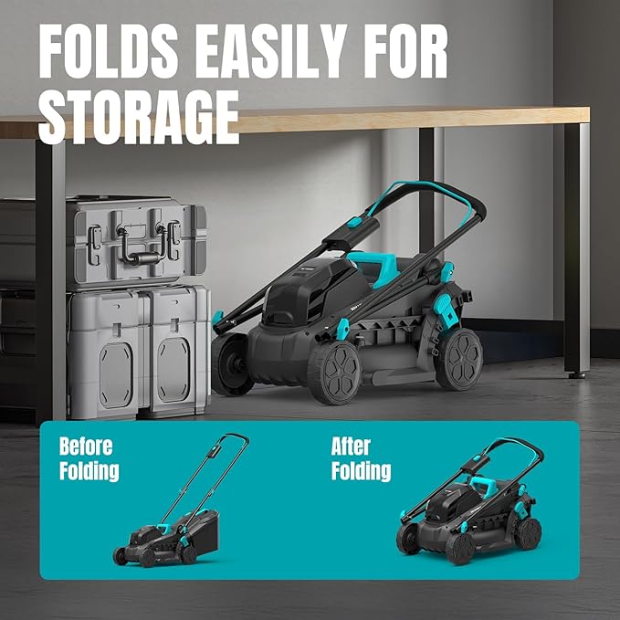 - EASY TO USE AND STORAGE:This walk-behind lawn mower weighs only 24 lbs, making it very light and convenient to pull and push, which eases your gardening and keeps you fatigue-free. The handle is foldable for compact storage and easy carrying.