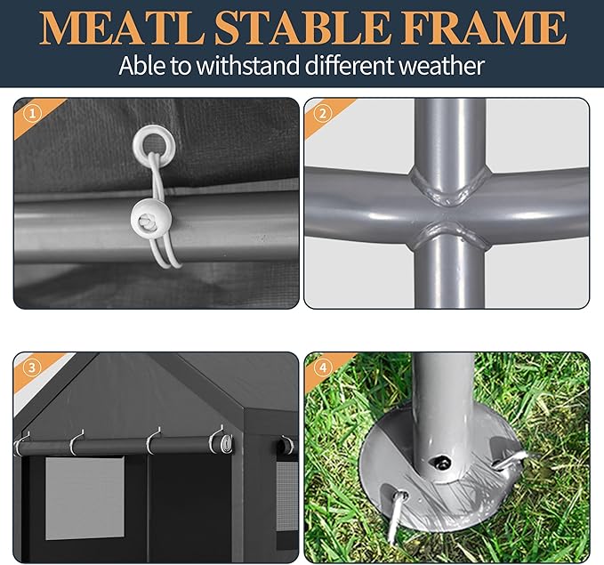 - 【Heavy Stable Metal Frame】: Our heavy duty car garage tent uses 8 strong φ38mm galvanized steel pipes, unique double wall construction, wall thickness of 0.8mm, durable. The surface is coated with anti-rust powder coating to prevent cracking, peeling, rust and corrosion.