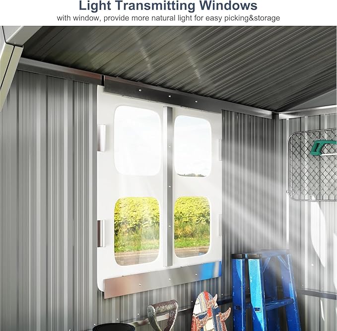 - 【Thoughtful Designs】Metal shed adds 2 transparent roof panels and 2 large windows, will flood the interior with more natural light, improve visibility and air circulation, make you feel comfortable when inside.
