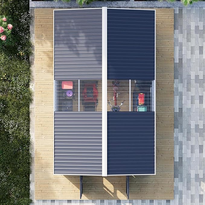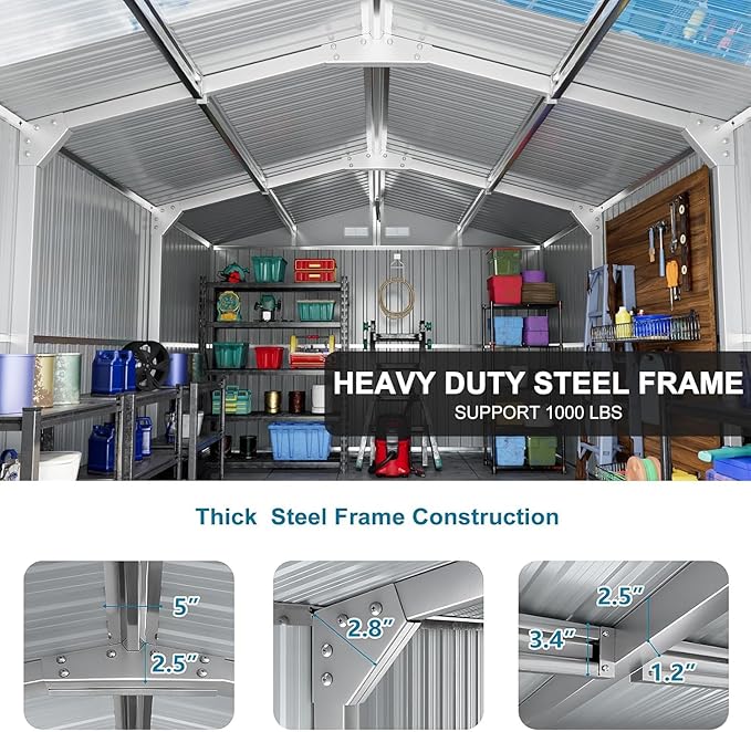 - 【Special Reinforced Frame】Storage shed not only adds 3 aluminum beams on the top but also a circle of aluminum support rods on the side, forming a wrapped reinforced frame as a whole. This design provides enhanced stability to withstand strong winds. Meanwhile, the galvanized & thickened metal panels ensure greater durability and corrosion resistance.