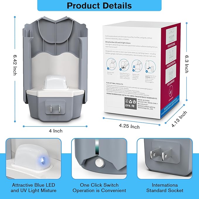 - Quick Fly Capture: Uses specially designed blue and UV light to efficiently attract and trap flies, fruit flies, moths, gnats, and other flying insects, ensuring fast results