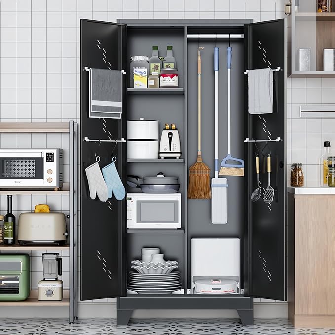 - 【Spacious Storage Space】Maximize storage space with the integrated hanging rod and hooks. This garage storage cabinet provides versatile organization for garden tools, cleaning supplies, and sports equipment, keeping everything tidy and accessible.