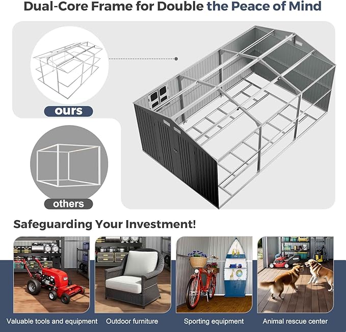 - 💪 FORTRESS-LIKE HEAVY-DUTY STEEL FRAME: Go beyond standard storage with a structure built for endurance. The backbone of this shed is an ultra-sturdy 0.6mm thick (22ga)galvanized steel frame, reinforced with an apex roof design that provides superior strength against sagging and warping. This robust framework creates an unwavering fortress for your most valuable assets, from heavy ride-on mowers and motorcycles to a full collection of tools and equipment.
