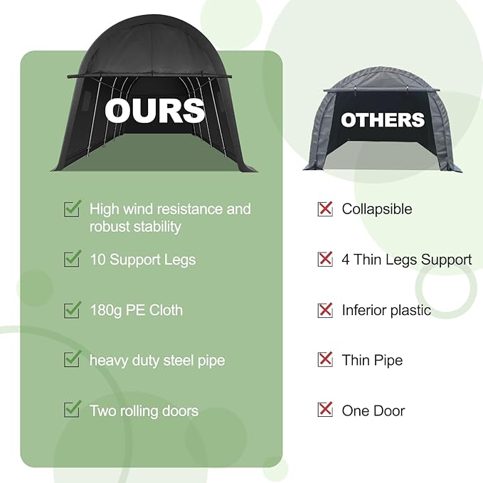 - ✅ 【Round Style Roof & Anti-Snow Waterproof】 Our car canopy features a round roof design and 180g PE waterproof tarpaulin, effectively reducing wind resistance and allowing for quick drainage to prevent water and snow accumulation, thereby extending the lifespan of the carport.