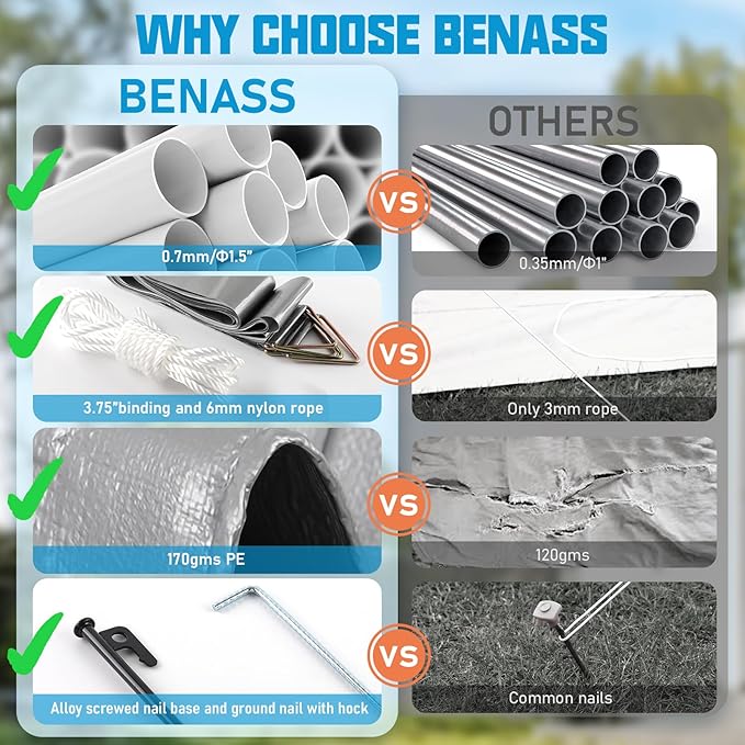 - Super Heavy Duty - Benass portable garage use 1.5" galvanized steel frame and 170gms PE canopy top, is more durable than others. Adding the accessories set, it will be firmer
