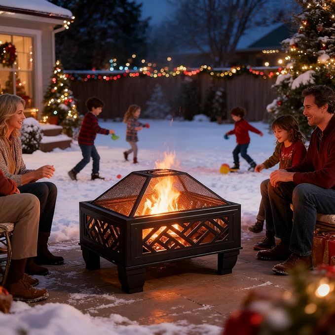 Breezz Update Version 26 Inch Wood Burning Fire Pit with Cooking Grill and Spark Screen, Outdoor Metal Firepit for Patio, Backyard, Bonfire Party, Camping and Garden