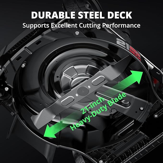 - 21-INCH DURABLE STEEL CUTTING DECK – Wide 21" walk-behind lawn mower deck reduces mowing time; rust-resistant steel deck improves durability, making it ideal for residential yard care and tough grass conditions.