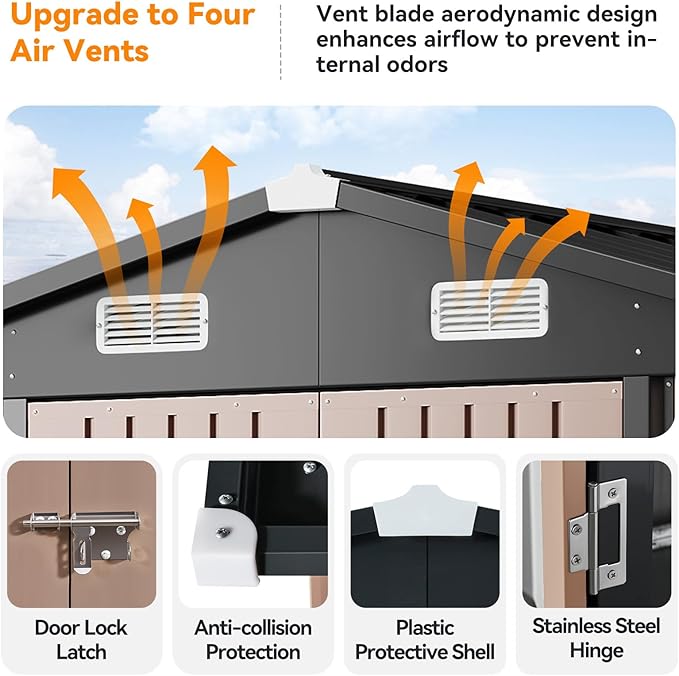 - DURABLE & WEATHERPROOF CONSTRUCTION: Built with a heavy-duty galvanized steel frame and reinforced wall panels, this shed withstands harsh elements for long-lasting use. The thick metal roof provides superior protection against rain, sun, and wind. Engineered for stability with a wind resistance rating of up to Grade 6 (24-30 mph) and a snow load capacity of up to 6 inches, ensuring your belongings are safe in various climates.