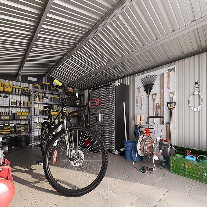 - SPACIOUS & VERSATILE STORAGE: Generous 79"L x 50"W x 74"H (6x4 FT) interior offers ample space for lawnmowers, bicycles, trash cans, pool equipment, and more. Optional storage racks (sold separately) help you organize tools and maximize space efficiently.