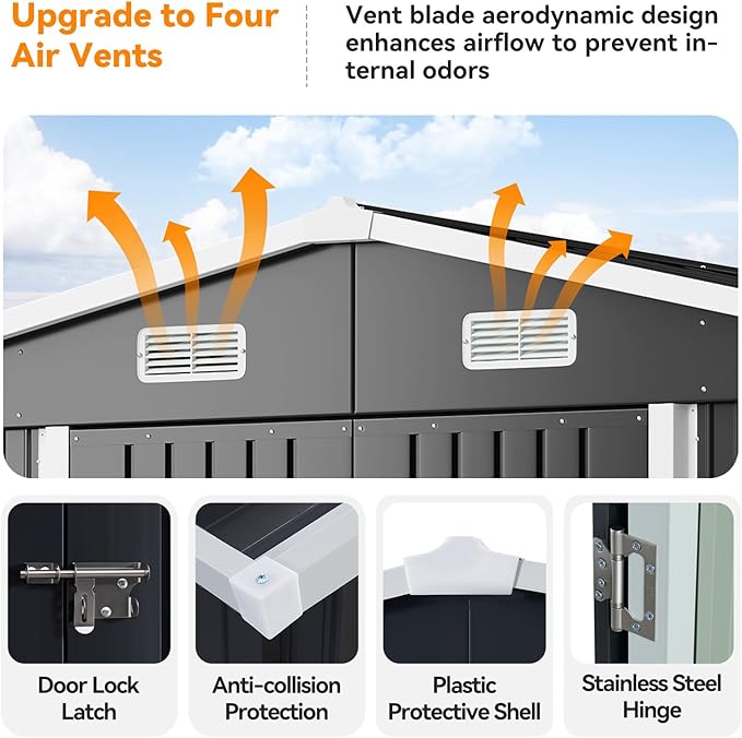 - DURABLE & WEATHERPROOF CONSTRUCTION: Built with a heavy-duty galvanized steel frame and reinforced wall panels, this shed withstands harsh elements for long-lasting use. The thick metal roof provides superior protection against rain, sun, and wind. Engineered for stability with a wind resistance rating of up to Grade 6 (24-30 mph) and a snow load capacity of up to 6 inches, ensuring your belongings are safe in various climates.