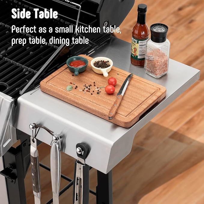 - User-Friendly Design: Equipped with 2 side tables for extra cooking space, a propane tank holder, 3 tool hooks, non-slip handles, and a built-in thermometer for accurate control. The wheels make movement easier