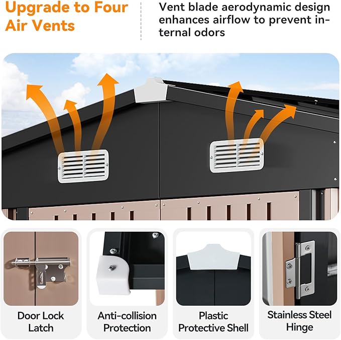 - DURABLE & WEATHERPROOF CONSTRUCTION: Built with a heavy-duty galvanized steel frame and reinforced wall panels, this shed withstands harsh elements for long-lasting use. The thick metal roof provides superior protection against rain, sun, and wind. Engineered for stability with a wind resistance rating of up to Grade 6 (24-30 mph) and a snow load capacity of up to 6 inches, ensuring your belongings are safe in various climates.