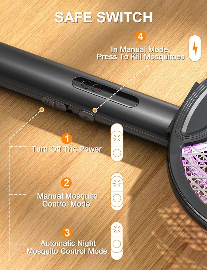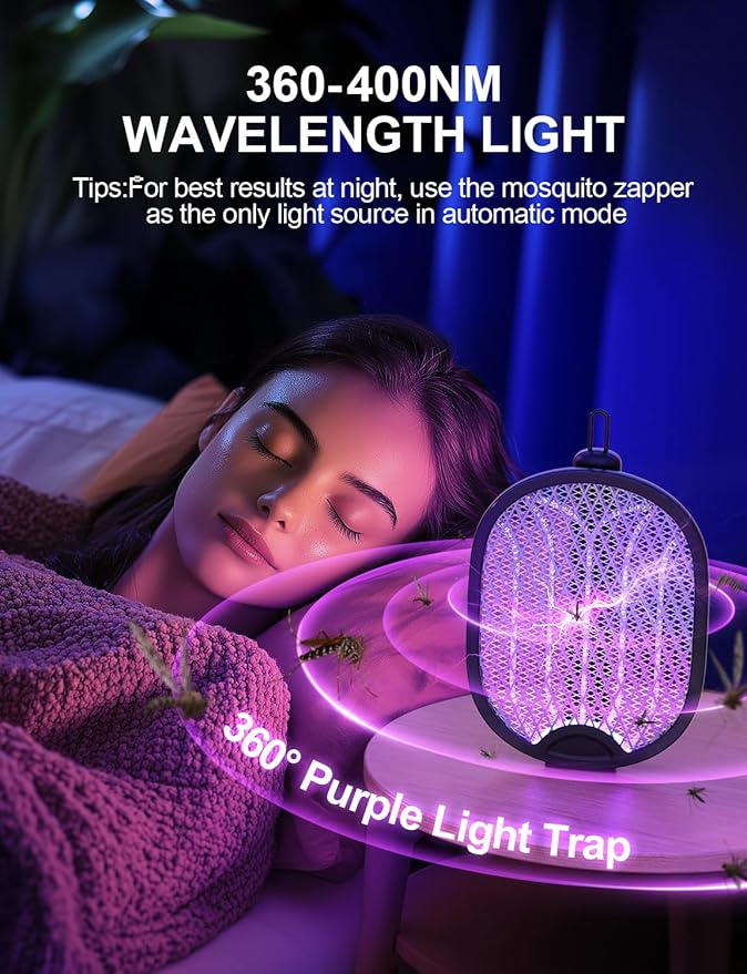 - Dual Mode Operation – In manual mode, the electric fly swatter activates only while you hold the lightning button, and the power cuts off automatically once released. In automatic mode, the built-in 360–400nm blue light effectively lures mosquitoes and gnats, working as an auxiliary bug zapper racket (not a full replacement for a dedicated bug zapper racket)