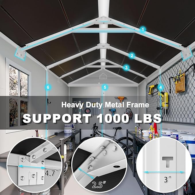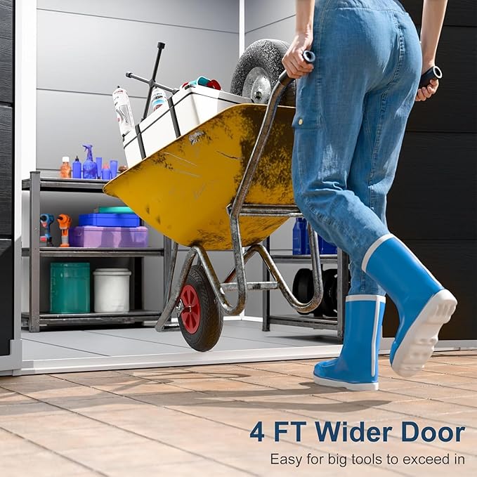 - 【Premium Resin Material Shed】 Our durable storage shed is crafted with 15MM premium polypropylene resin plastic, which is thicker than others in the market. Resin shed is waterproof, rustproof and UV-resistant, less bending and puncturing, worry-free for use in all weather conditions. It is a great shed house for your backyard, patio and garden