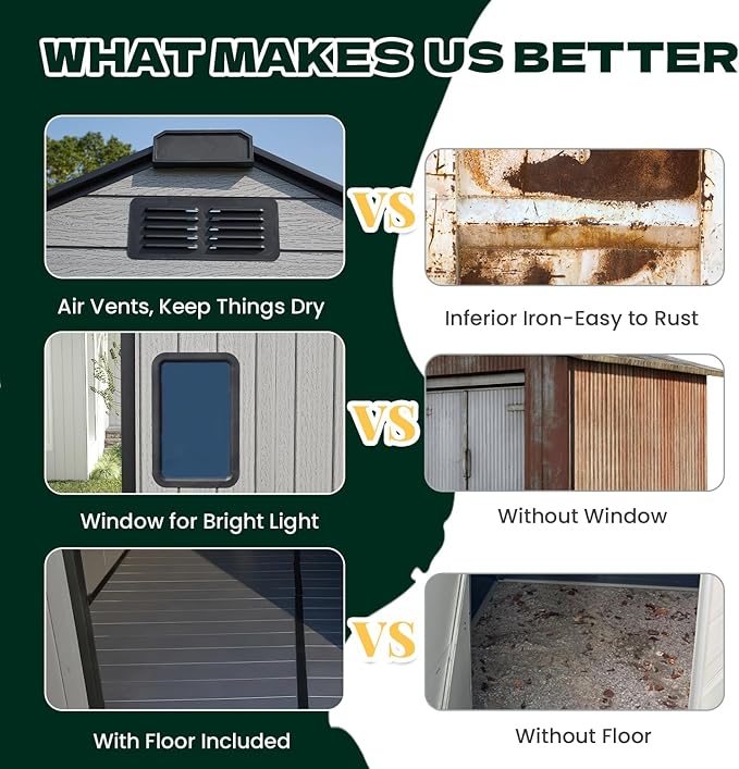 - Easy and Time-Saving Installation: The one-piece panel plug-in structure reduces installation time by 30% compared to traditional sheds. If you encounter any installation problems, please feel free to contact us, we will provide 24-hour answer service. Please rest assured that since the manual contains the installation process of all sizes currently on sale, you only need to read part of it