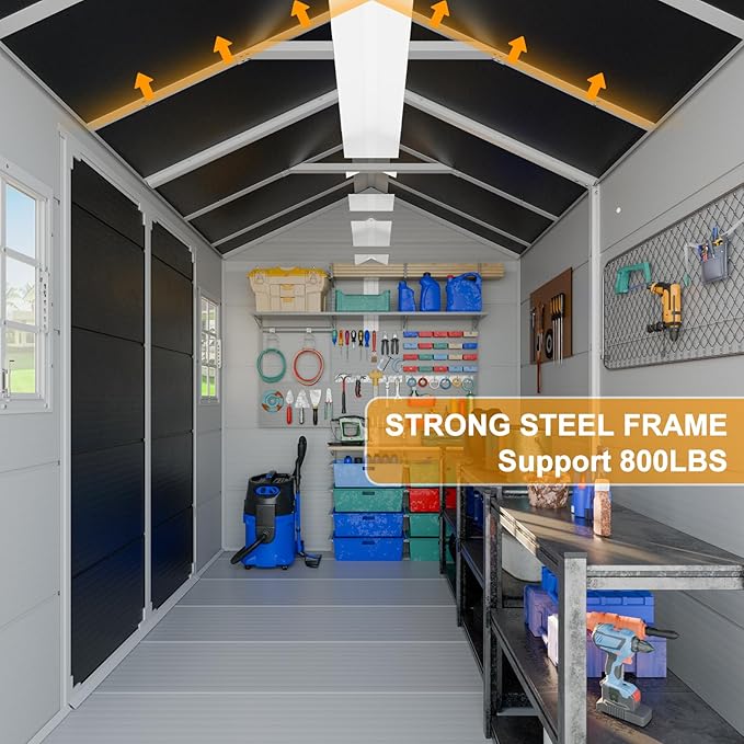 - Floor &Vents Inlcuded : The extra-wide front double doors for greater flexibility in organizing and accessing items, included shed floor,built-in ventilation prevents damp environment, enhanced safety for tools and equipment with lockable doors, Included D-Clip wall anchors to support shelves & hangers