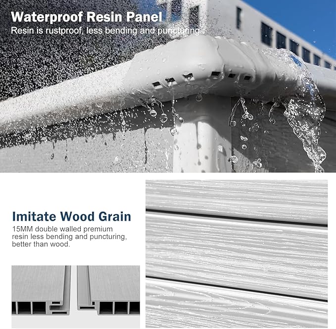 - Waterproof and Gurantee: Resin and plastic mix material with painted outter, make the shed waterproof. All parts are plug in tightly. We also provide silicone sealant to make the panels fit more tight and prevent potential leaks.We offer lifetime warranty, if you have any problems we will provide with you the best solution within 24hrs