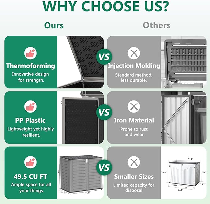 - SPACIOUS INTERIOR: With generous internal dimensions, this garbage can storage shed easily accommodates large bins and bulky items—providing a reliable solution for storing trash containers, tools, bikes, and more. A shed that truly maximizes your outdoor space