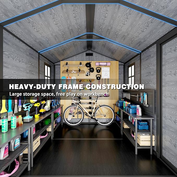 - ALL-WEATHER DURABILITY: Crafted from premium-grade thermoplastic synthetic resin, this backyard storage shed can withstand various elements; Its 12mm thick double-layer resin panels won't easily deform or crack; The shed's waterproofing, and UV resistance make it suitable for diverse weather conditions; The fade-resistant, friendly materials help achieve low maintenance costs and durable longevity