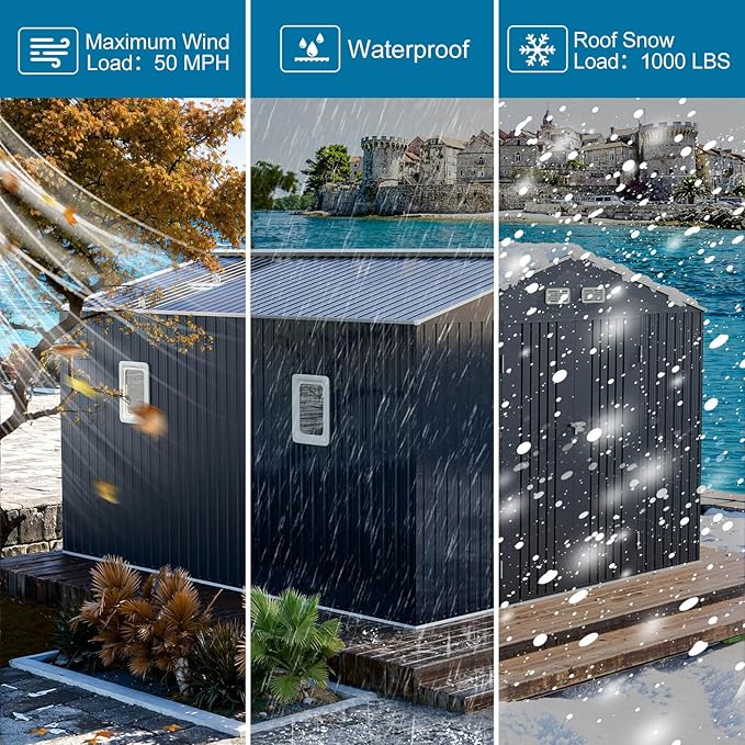 - 【Special Reinforced Frame】Storage shed not only adds 3 aluminum beams on the top but also a circle of aluminum support rods on the side and base frame, forming a wrapped reinforced frame as a whole. This design provides enhanced stability to withstand strong winds. Meanwhile, the galvanized & thickened metal panels ensure greater durability and corrosion resistance.
