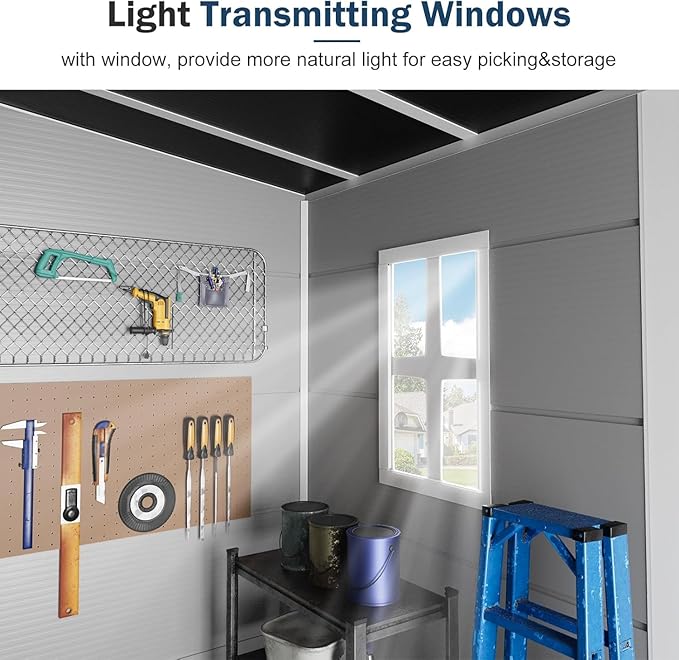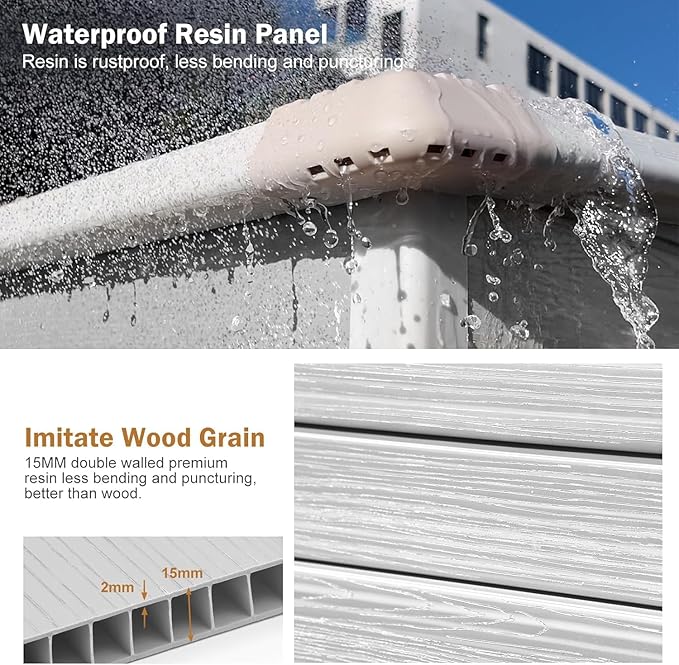- Premium Durability and Weather Resistance: Crafted with 14mm tough double-wall resin and an impact-resistant dark floor, this storage unit ensures long-term durability. Its waterproof and moisture-proof panels, along with UV resistance, guarantee worry-free use in diverse weather conditions.